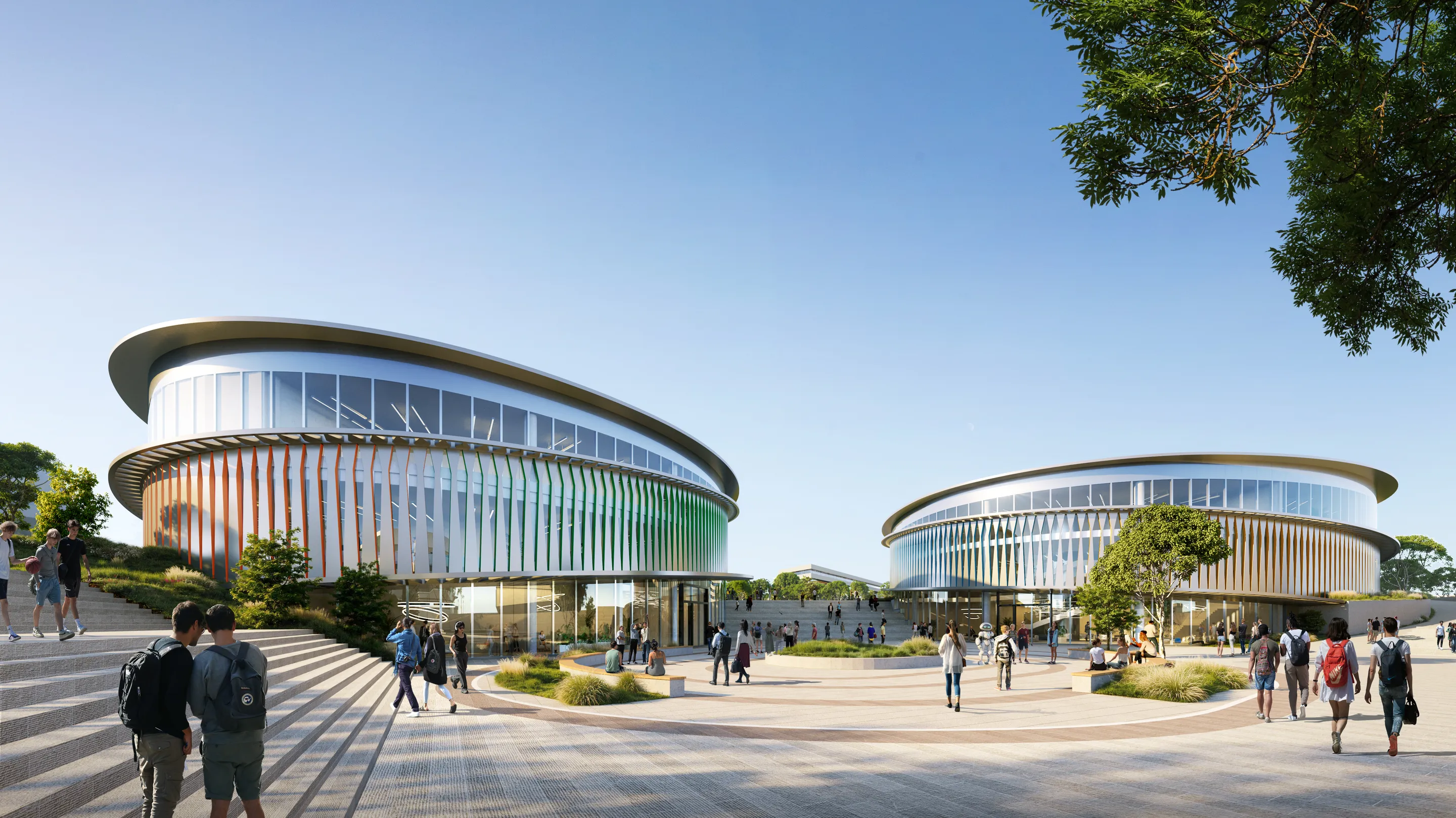 The Central Plaza acts as the campus's primary public space, encouraging interaction and community engagement. This area is defined by a 200-metre-long Digital Wall Facade with rotating, programmable fins, which serves as a unifying landmark.