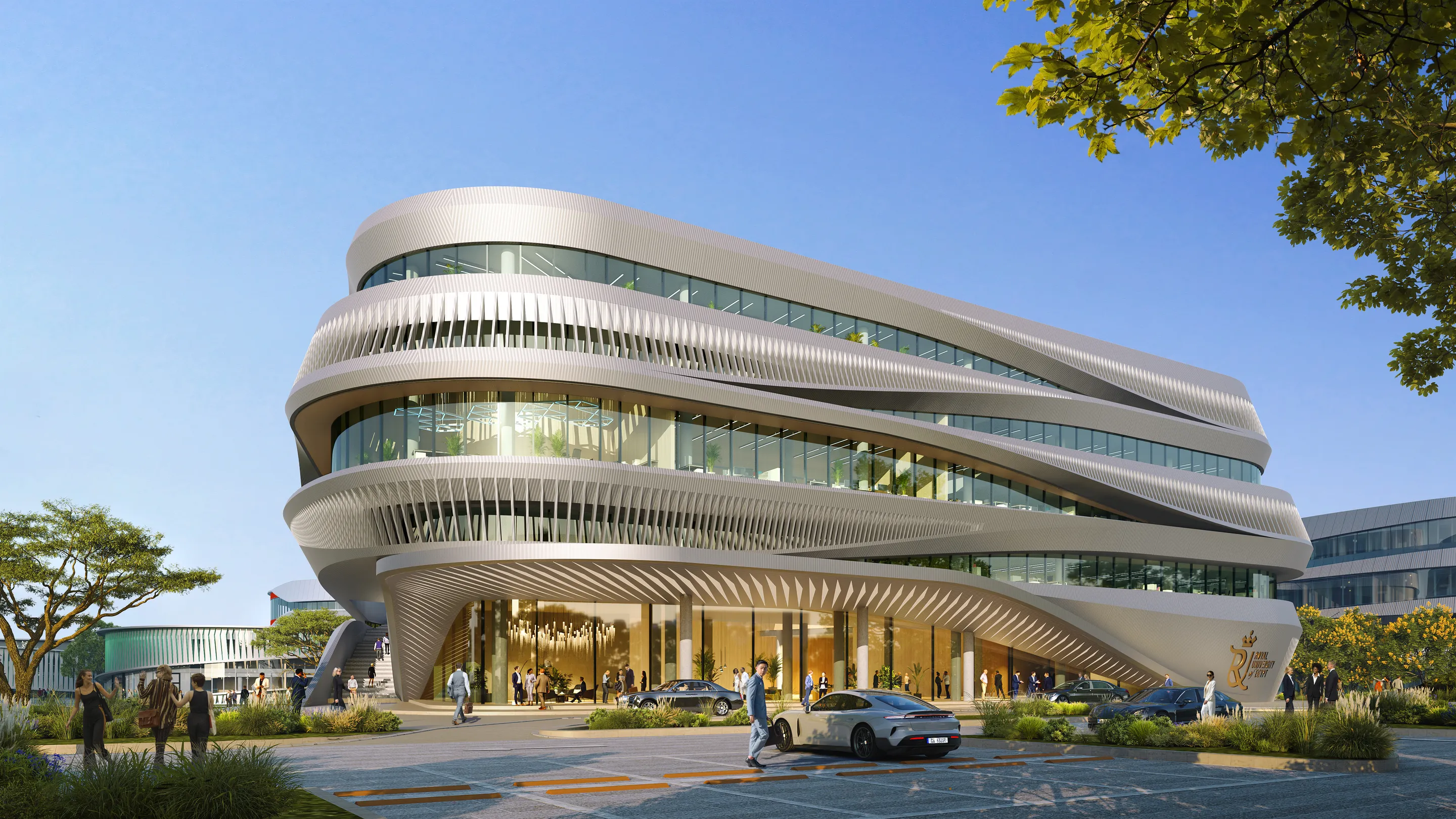 The design's sculptural form is inspired by the flowing lines of desert dunes, creating a form that is rooted in its landscape. The facade blends dynamic shapes with a sense of place, drawing inspiration from the local environment and the six colours of ancient Egypt.