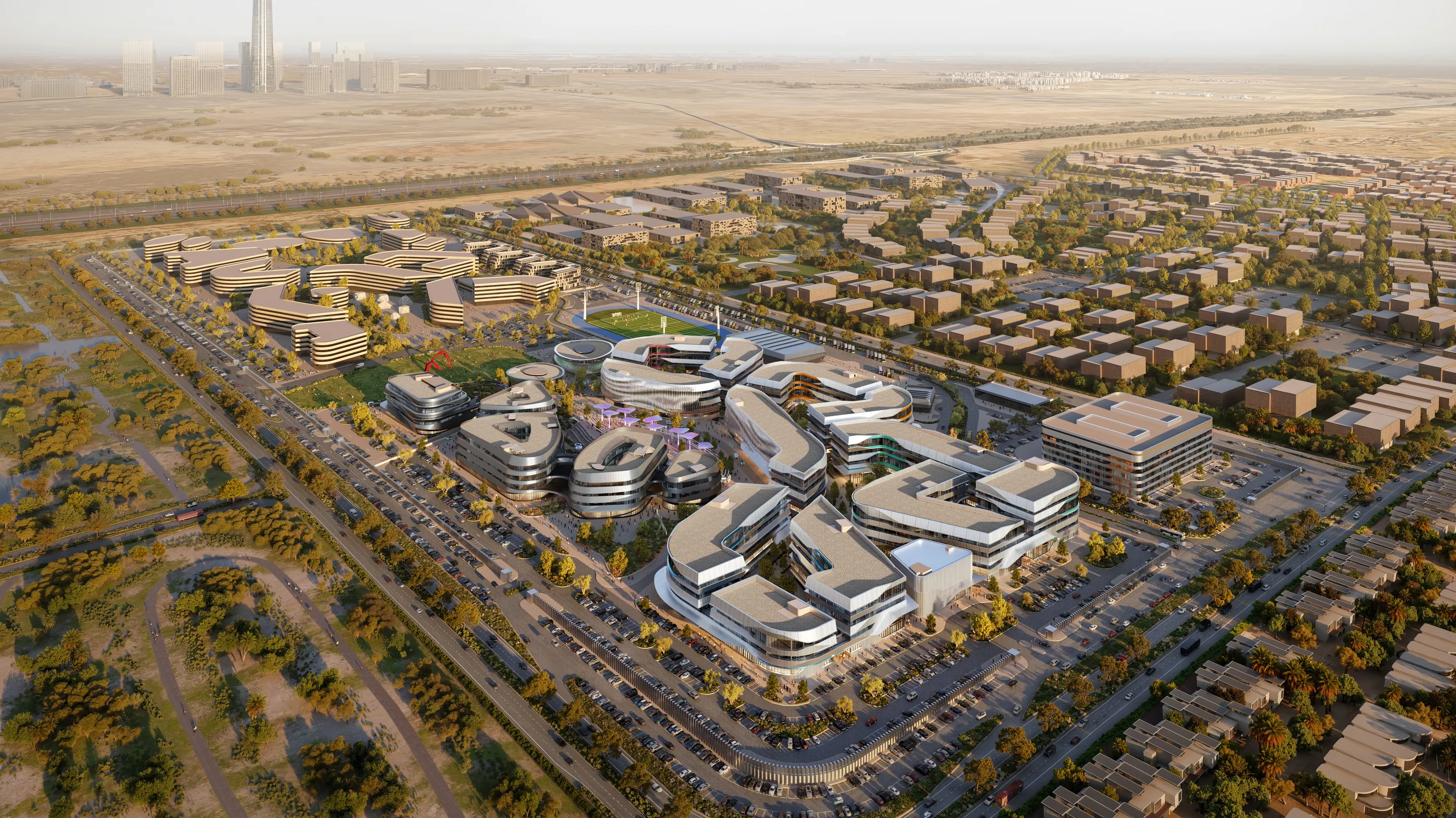 Located 50 km from Cairo, UNS’s design for the Egypt Science Park campus is a future-ready ecosystem where architecture, nature, and technology converge. The campus includes 28 buildings, featuring 15 educational faculties in five clusters, six residential dormitories, and an iconic cafeteria and library pair. A central Creative Cluster and a dedicated Research Center are designed to drive innovation and academic exchange.