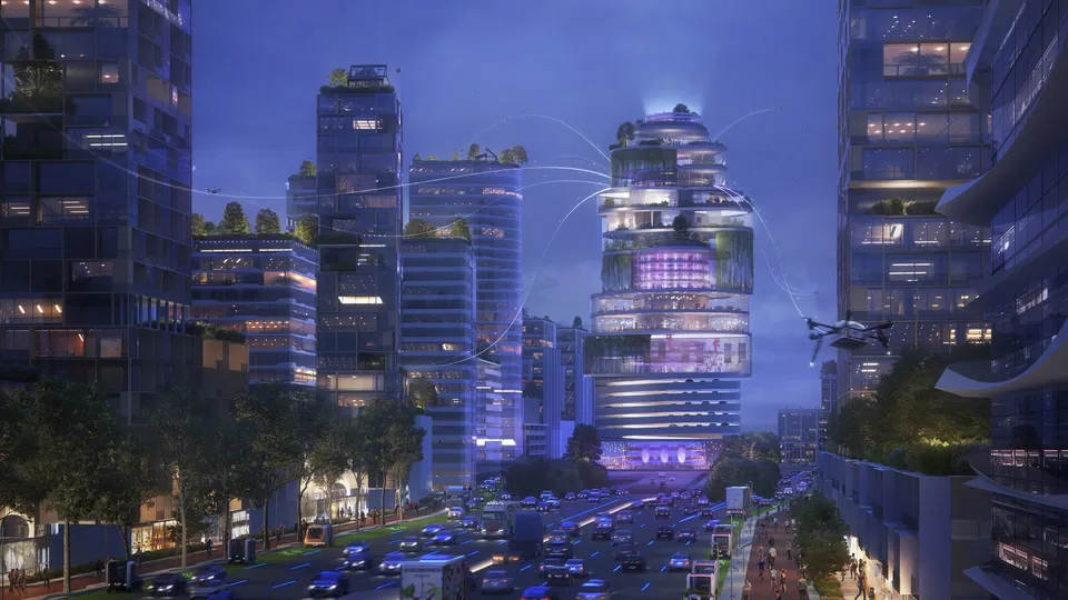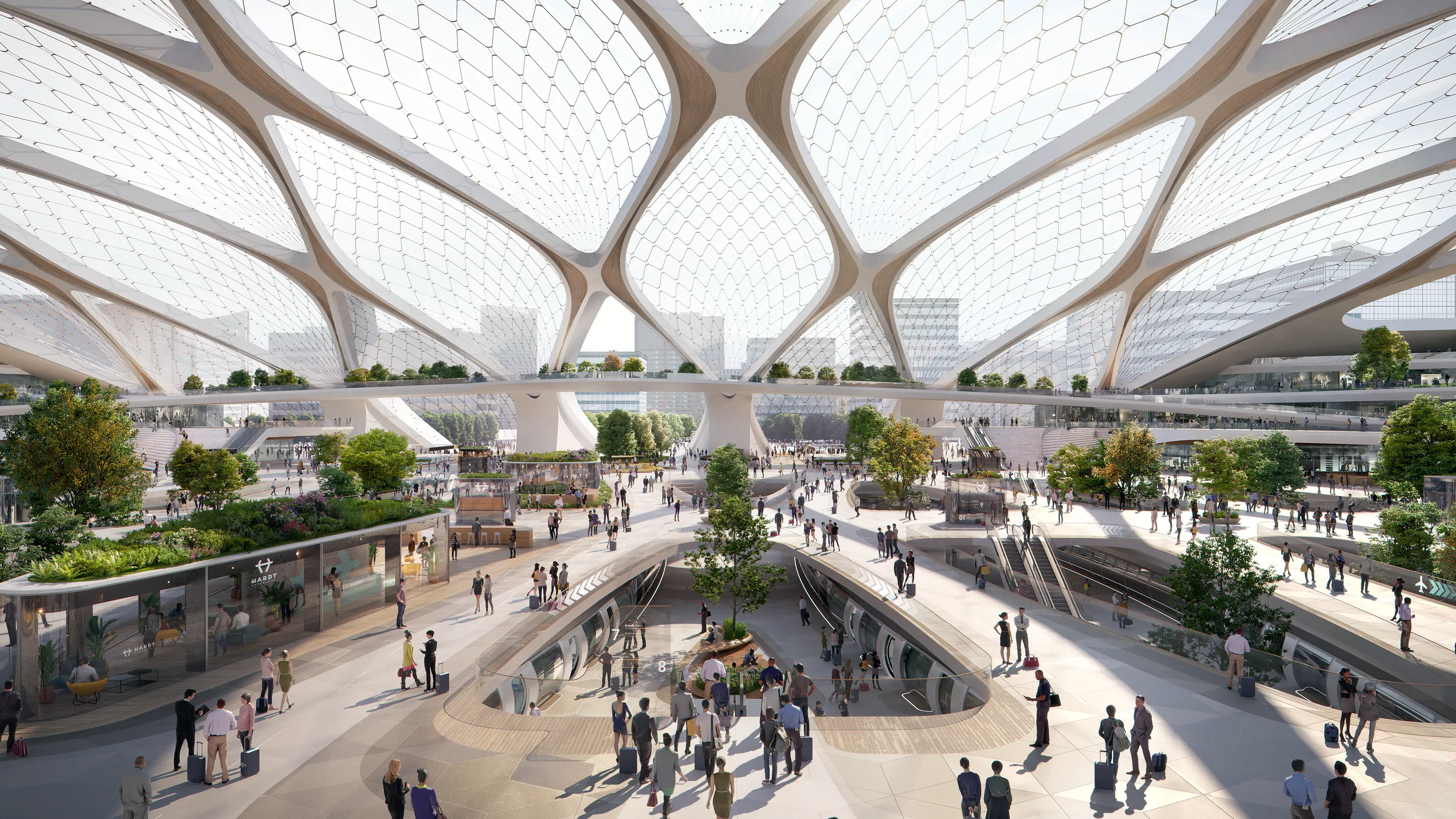 The station design is based on modularity and adaptability, allowing it to integrate seamlessly into various urban contexts, from city centers to low-rise areas. The modular framework organises functional spaces, such as luggage check-ins, bicycle docks, and biophilic parks, while also enabling the station to act as an energy hub, storing and distributing solar power. The hyperloop’s speed and efficiency not only transform passenger travel but also enable new possibilities for knowledge transfer, urban workspaces, and hyper-local economies, reshaping how cities connect and function.