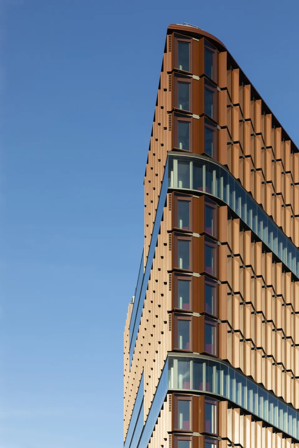 The building’s exterior, described as an "urban speaker," combines a protective shell with human-scale interior materiality. Fully glazed areas face the park, offering balconies and sun shading, while semi-glazed and opaque zones transition towards the housing area. Sustainable features include BIPV solar cells and integrated planting that extends the nearby park into the building. At night, the illuminated facade reveals the building’s layers, creating a striking presence in Seoul’s skyline and embodying the performance-driven essence of the music industry.