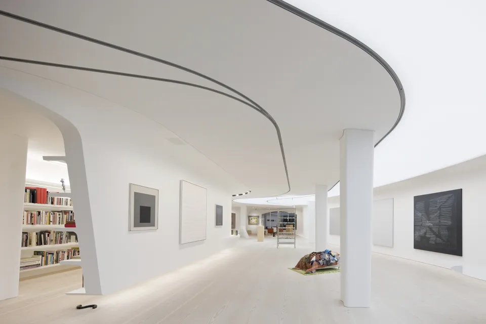Other custom-designed features include an oak and bronzed steel bookshelf, a fireplace art niche for large canvases and sculptures, and a suspended arch partition wall in the kitchen. These elements form a cohesive backdrop that highlights the art collection while maintaining a unique and functional living space.