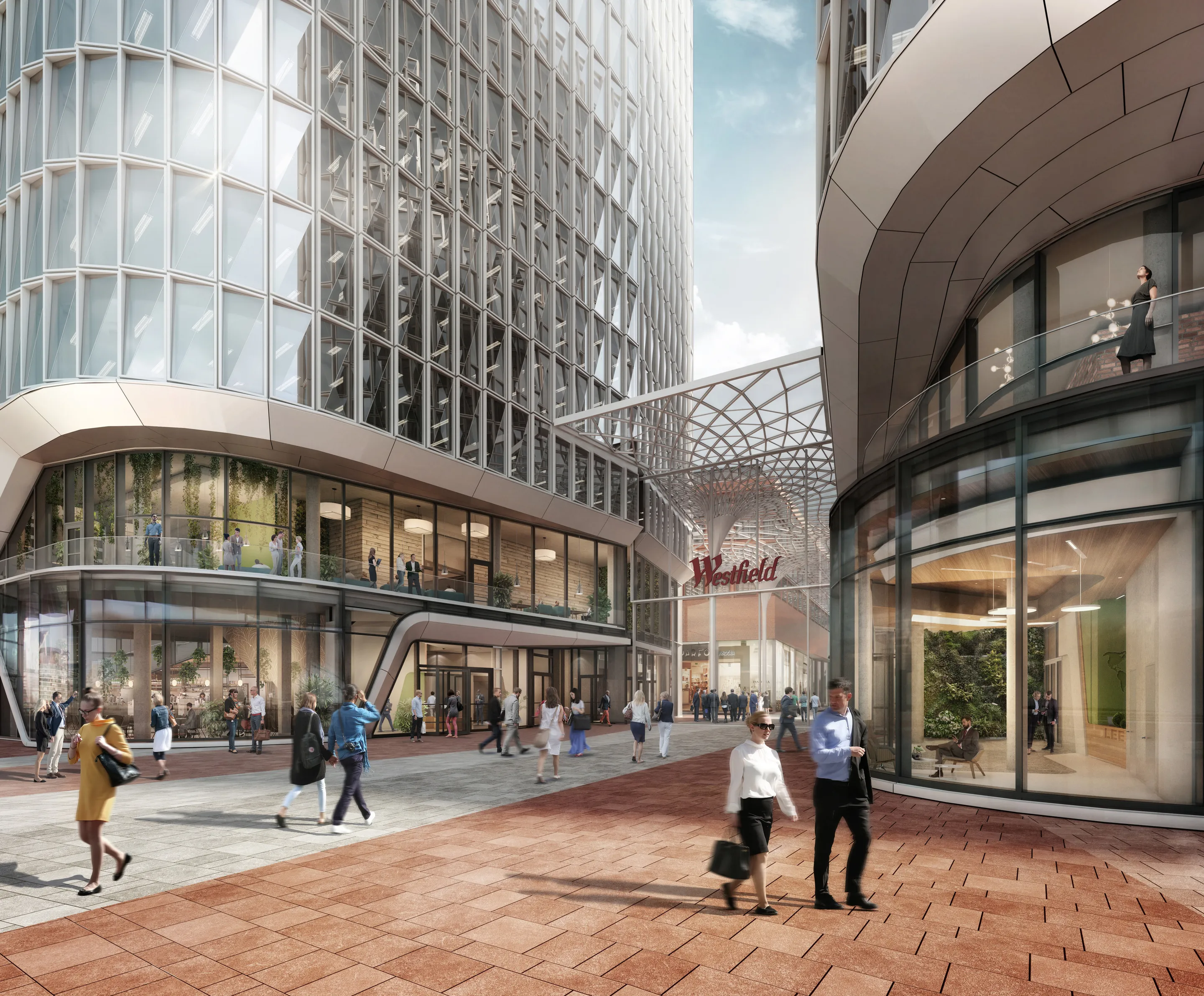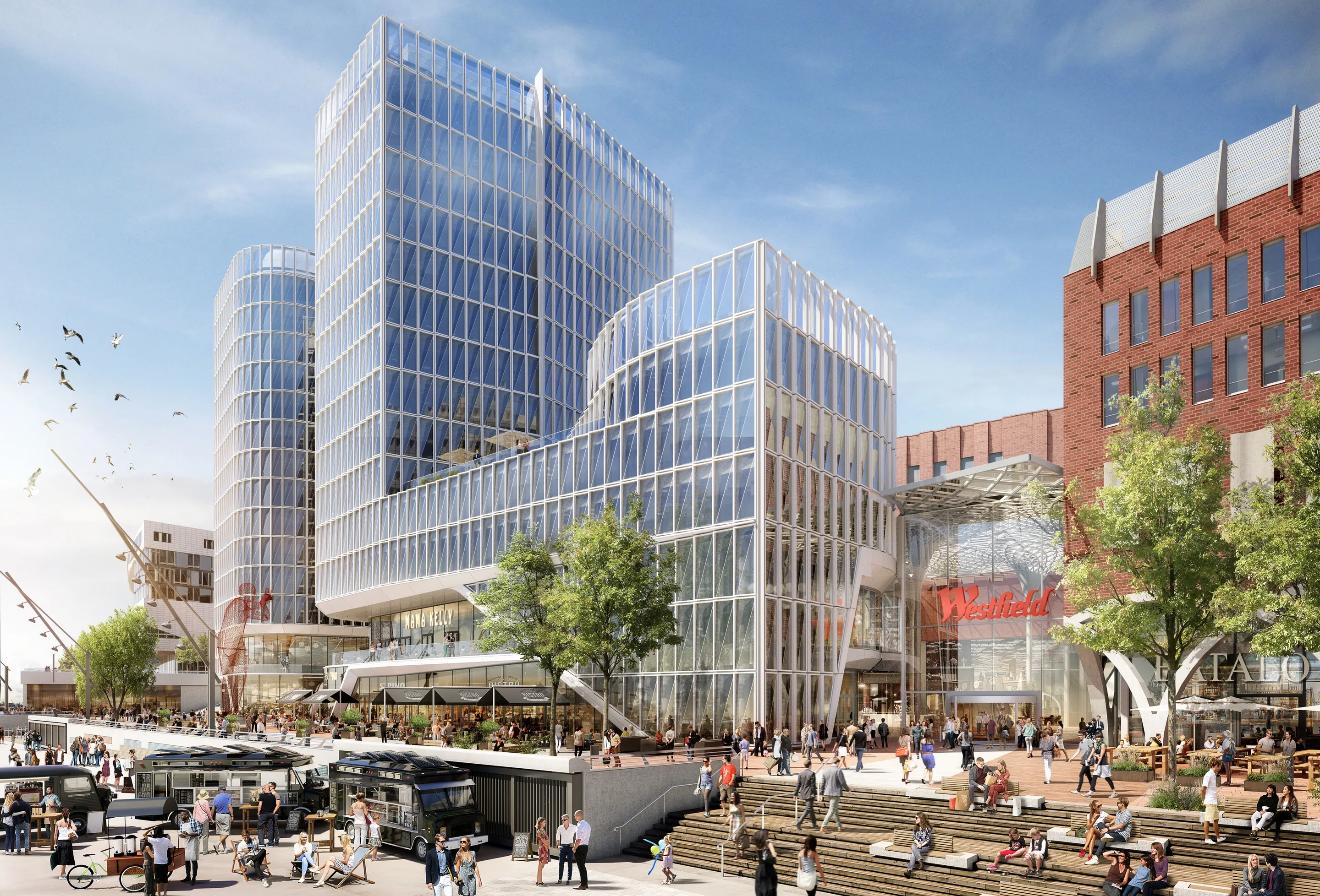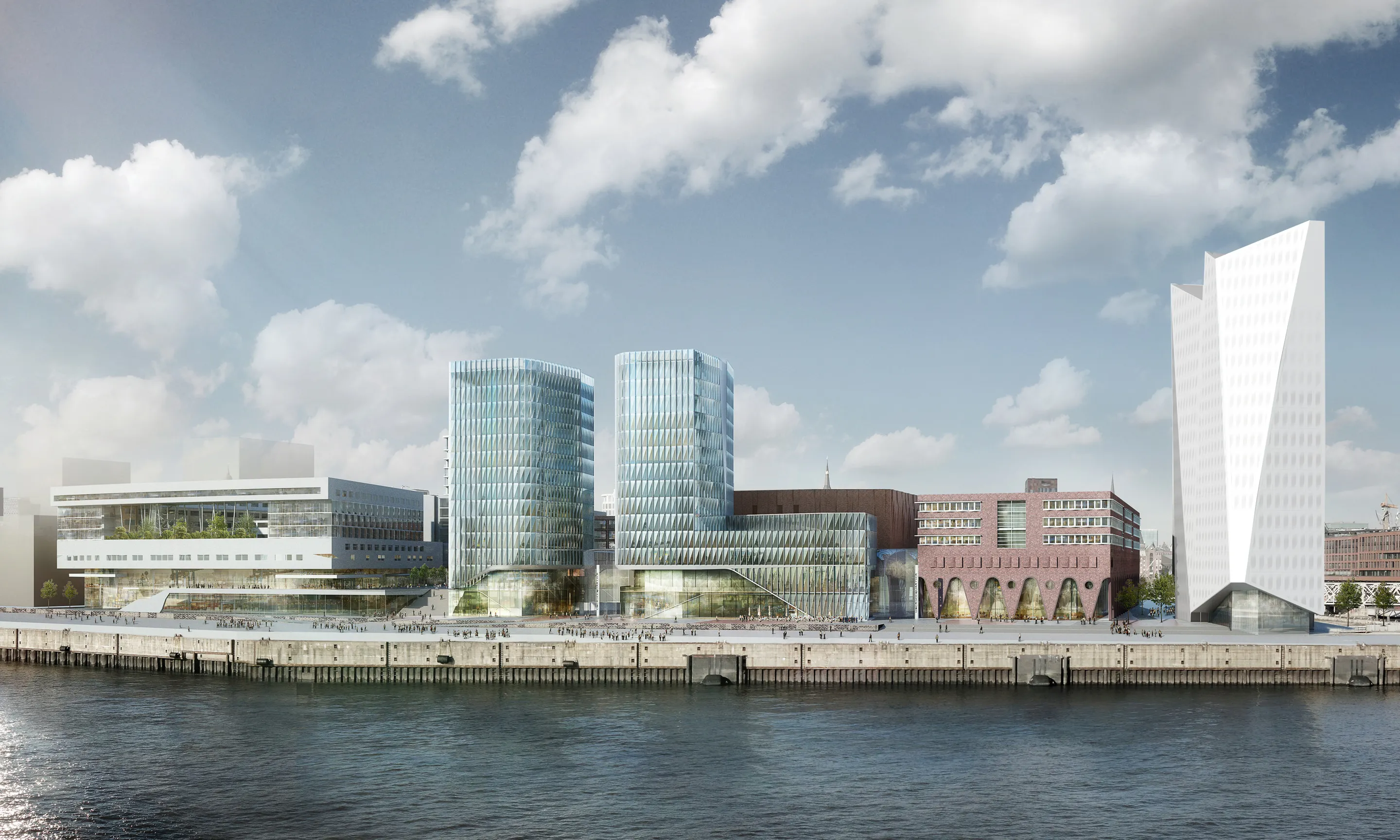 The Westfield Hamburg Überseequartier is located in Hamburg Hafen City along the River Elbe, forming a landmark at the end of Überseeboulevard. The towers frame a waterside entrance to the Überseequartier and the city, continuing the block structure of Southern Überseequartier while guiding sight lines and opening views to the waterfront.