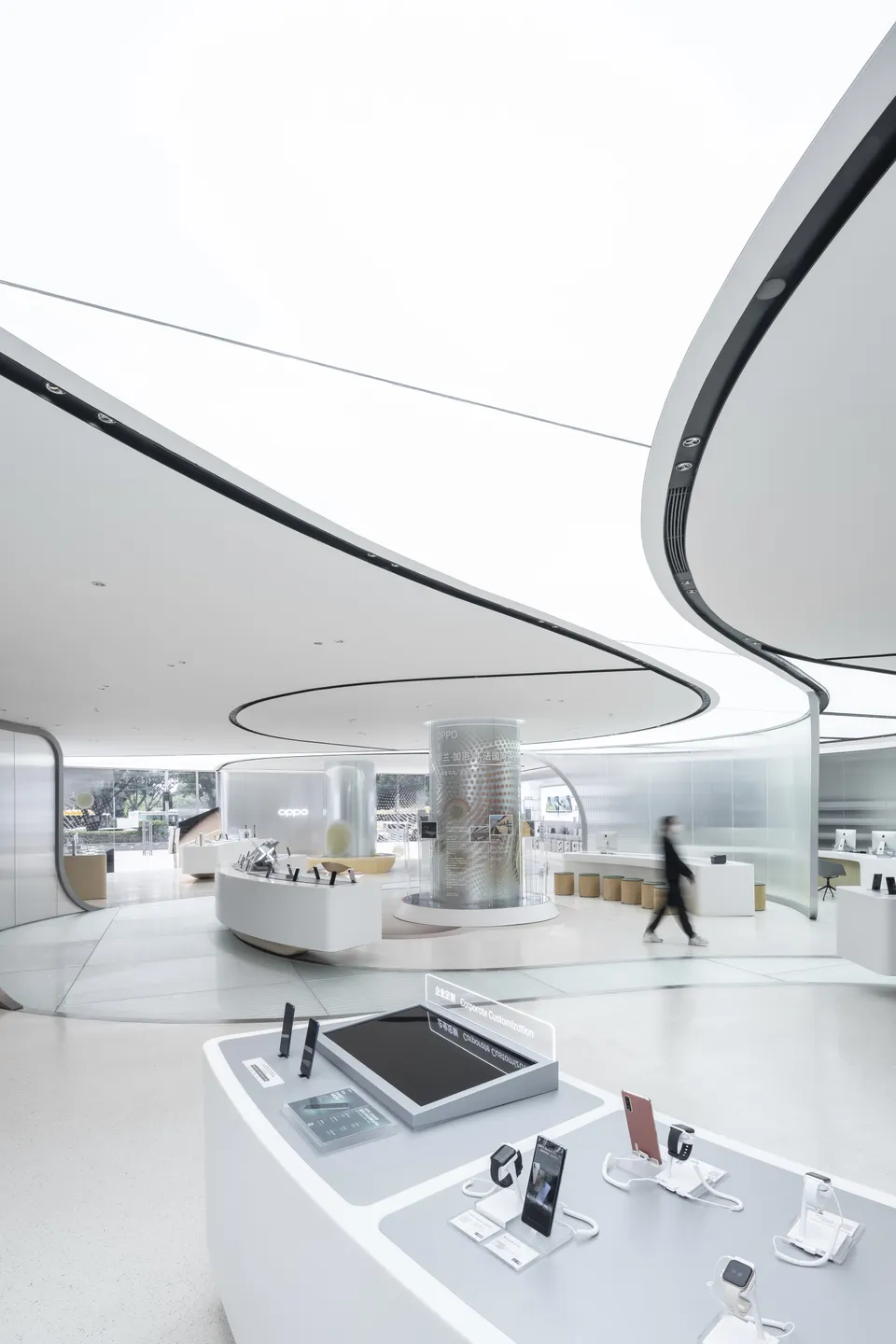 The design for the OPPO Beijing store introduces a refined retail experience that aligns with OPPO’s brand philosophy of “Beauty through Technology.” Spanning 428m2 across two floors, the store features a fully glazed, double-height facade that enhances visibility and creates a striking presence. Inside, the design continues the ‘Urban Park’ concept from the Guangzhou flagship, with a sculptural staircase serving as a central feature that connects the two levels and becomes part of the customer journey.