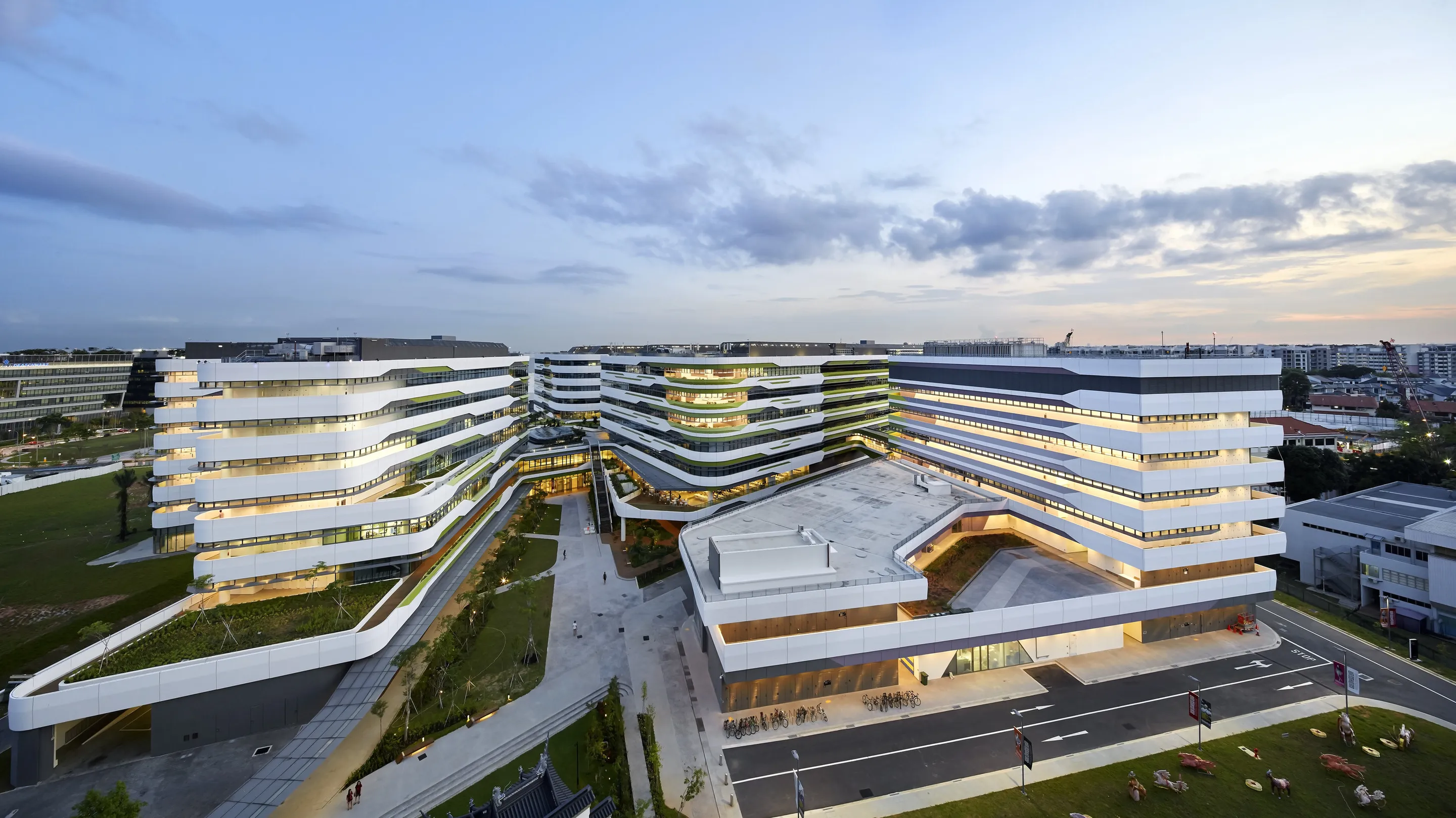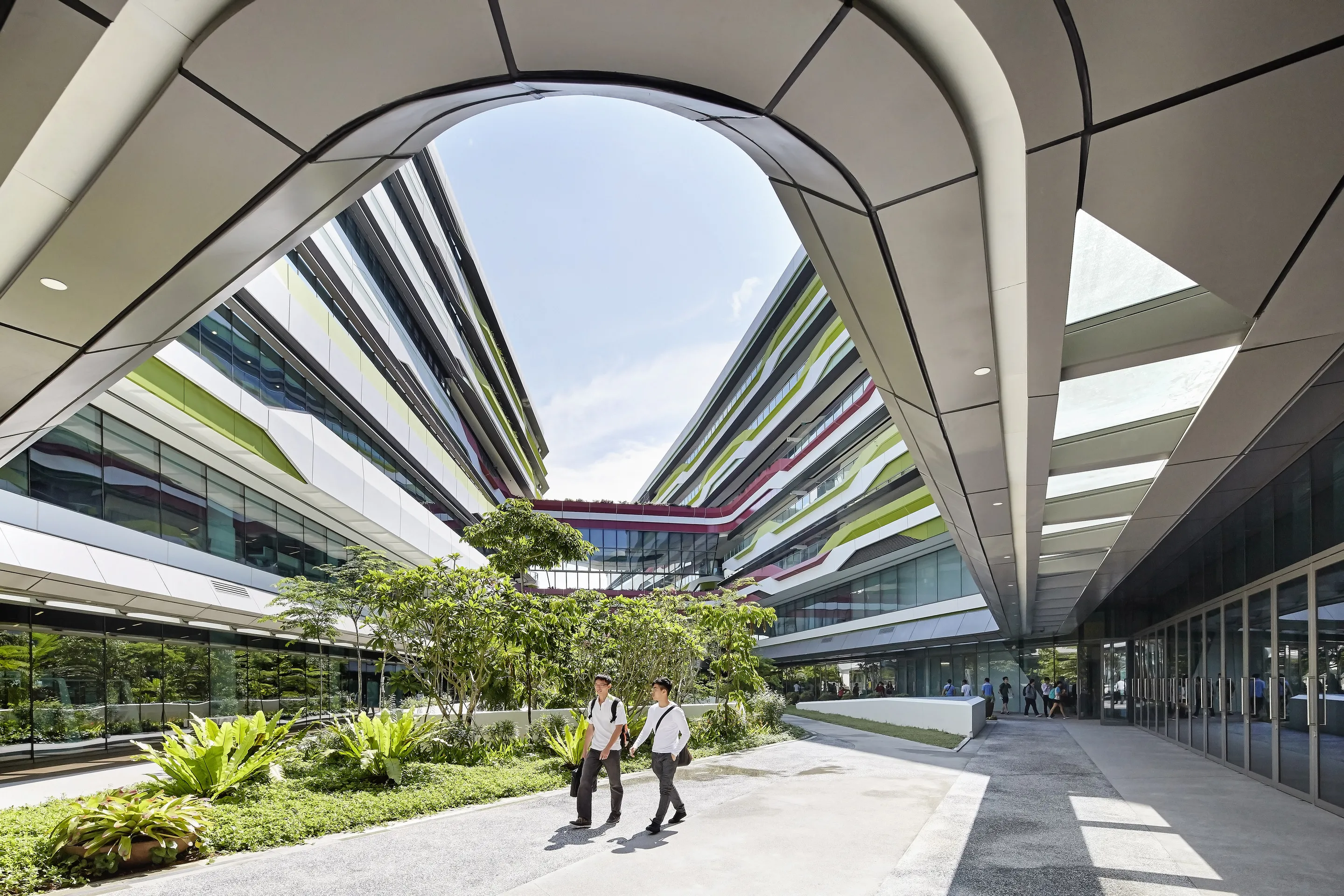 The Singapore University of Technology and Design (SUTD) campus, designed in collaboration with DP Architects, reflects the evolving needs of modern learning institutions. Located near Changi Airport and Business Park, the campus supports SUTD’s four academic pillars: Architecture and Sustainable Design, Engineering Product Development, Engineering Systems and Design, and Information Systems Technology and Design. It fosters cross-disciplinary collaboration, innovation, and interaction between academia, professionals, and the community.